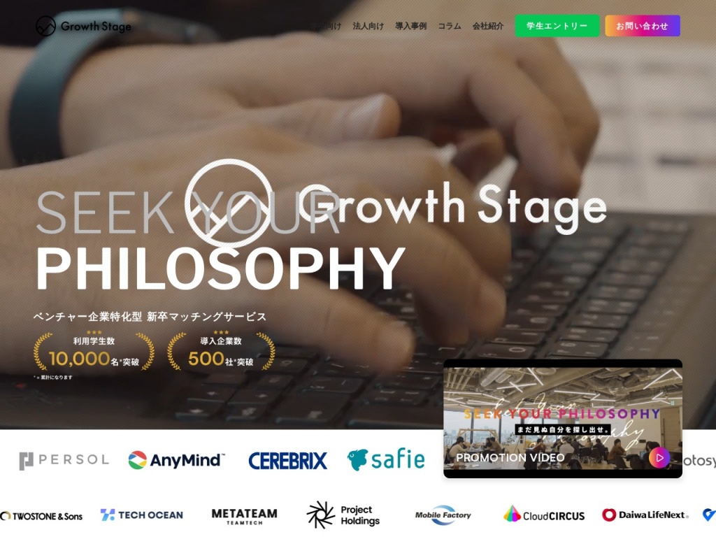 事例1:Growth Stageに新卒入社したAさんは、入社3年目でマーケティング部門の責任者に。5年目には執行役員に就任し、現在は同社の取締役として経営に参画しています。大手企業では10年以上かかるキャリアパスを半分の時間で達成しました。